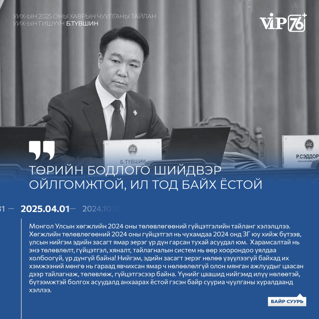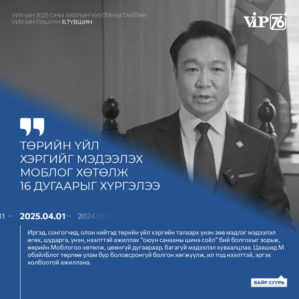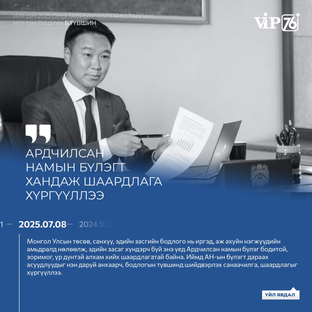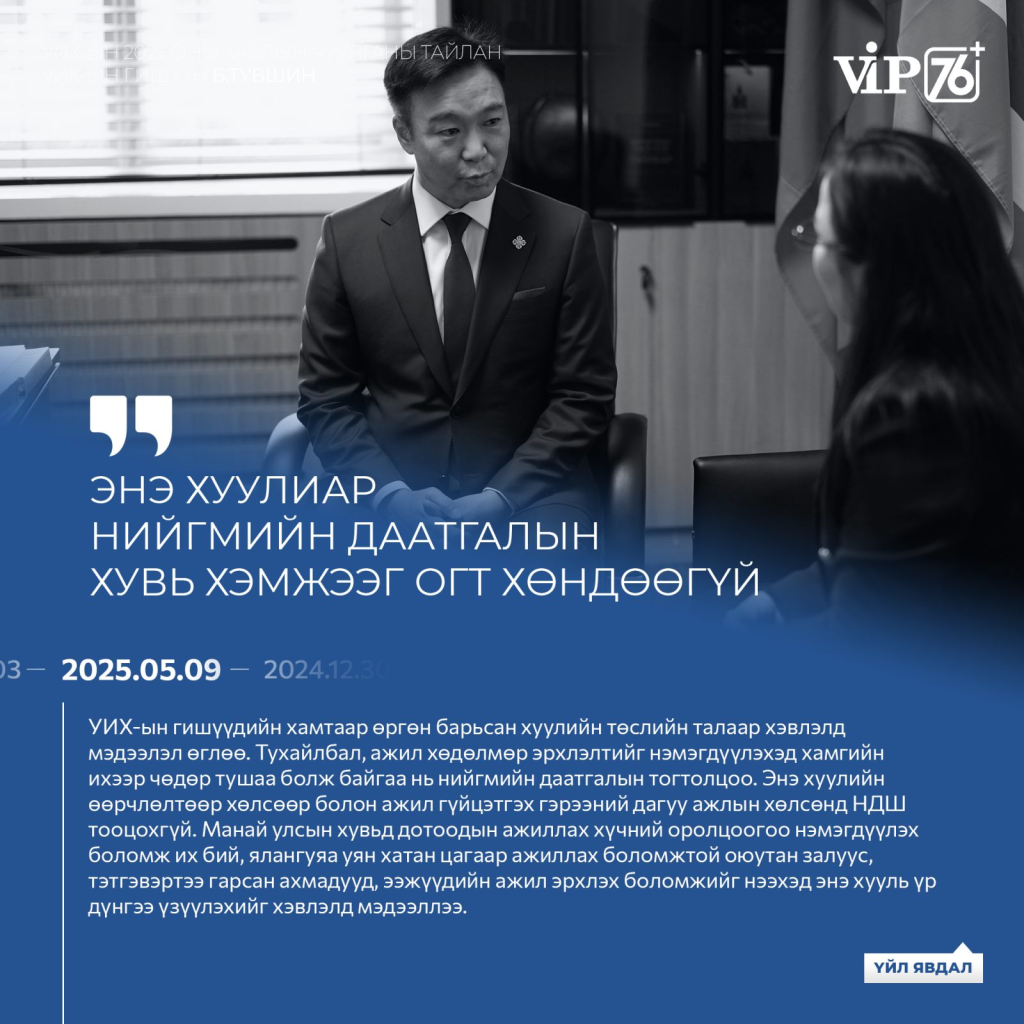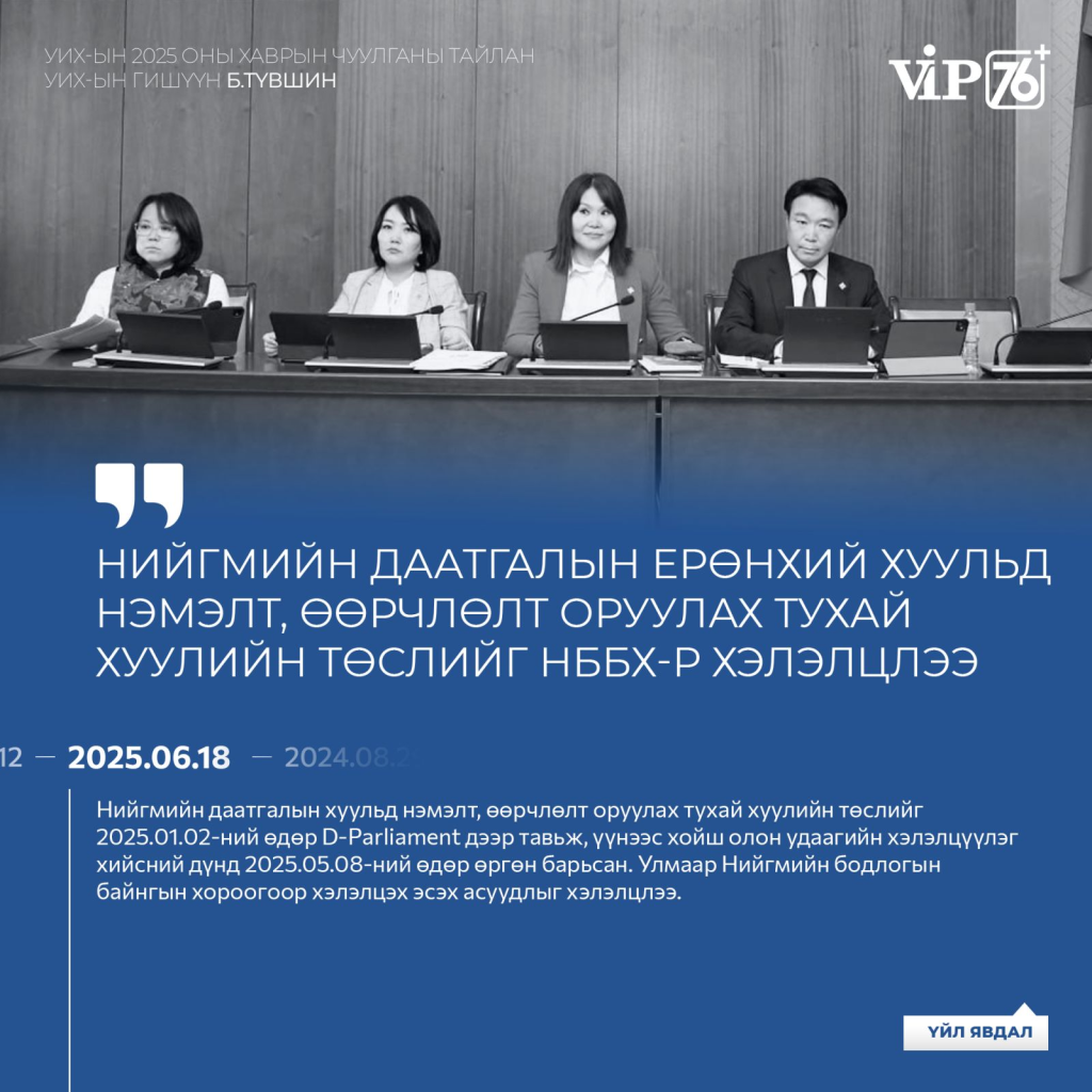 УИХ-ын гишүүн Б.Түвшин нэг жилийн хугацаанд ямар хуулийн төсөл санаачилж, ямар ажлуудыг хийсэн тайлангаа өөрийн цахим хуудсаараа дамжуулан иргэд сонгогчдод танилцуулжээ.
