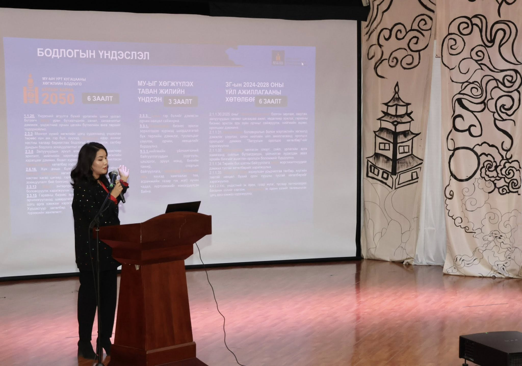 “ЗАЛУУЧУУДЫН ХӨГЖЛИЙН ТӨЛӨӨХ ТҮНШЛЭЛ: САЛБАР ДУНДЫН УЯЛДАА ХОЛБОО” ҮНДЭСНИЙ ЧУУЛГАНЫ ХҮРЭЭНД САЛБАР ХЭЛЭЛЦҮҮЛЭГ ЗОХИОН БАЙГУУЛЖ БАЙНА.
