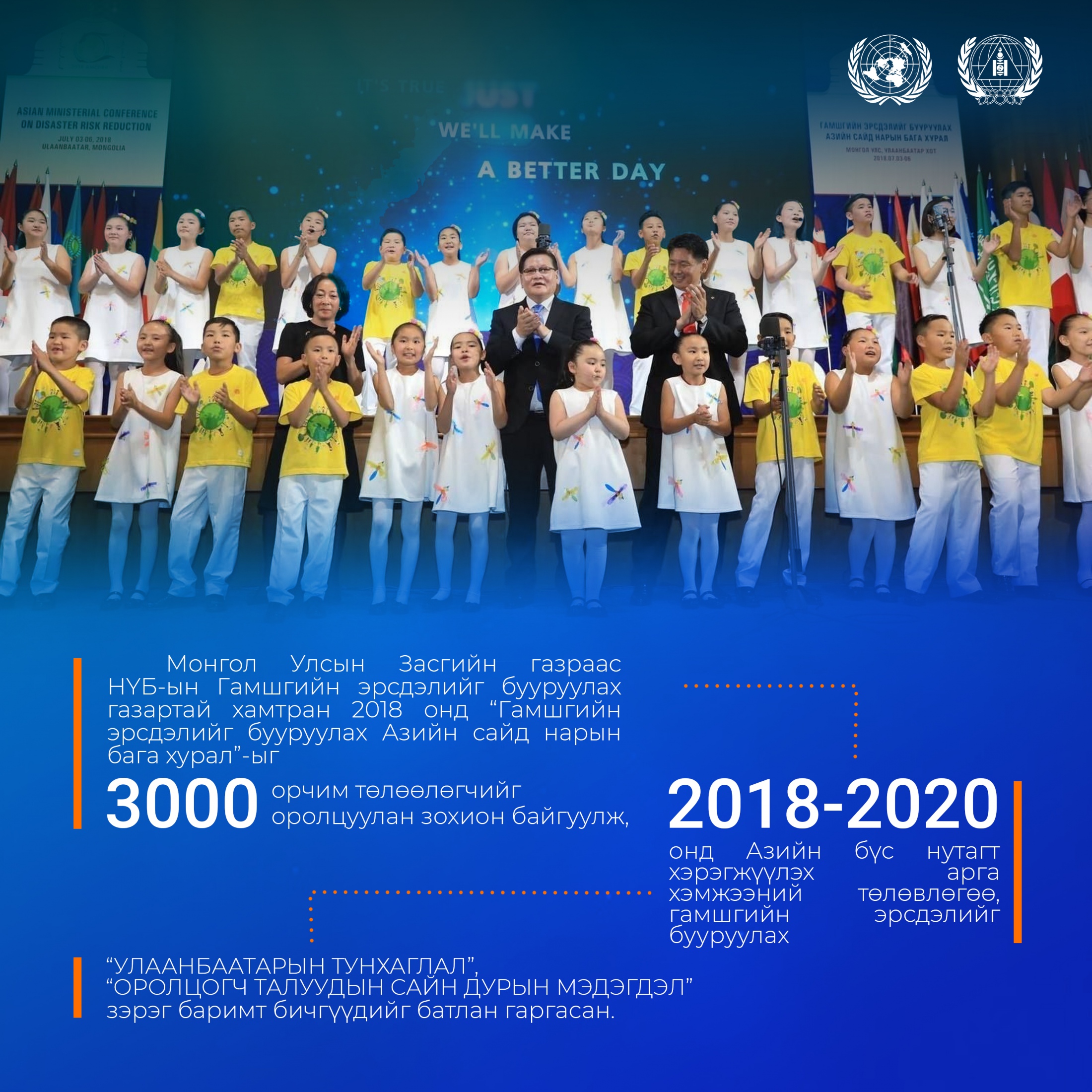 Монгол Улсын Засгийн газраас НҮБ-ын Гамшгийн эрсдэлийг бууруулах газартай хамтран 2018 онд “Гамшгийн эрсдэлийг бууруулах Азийн сайд нарын бага хурал”-ыг 3000 орчим төлөөлөгчийг оролцуулан зохион байгуулж, 2018-2020 онд Азийн бүс нутагт хэрэгжүүлэх арга хэмжээний төлөвлөгөө, гамшгийн эрсдэлийг бууруулах “Улаанбаатарын тунхаглал”, “Оролцогч талуудын сайн дурын мэдэгдэл” зэрэг баримт бичгүүдийг батлан гаргасан.