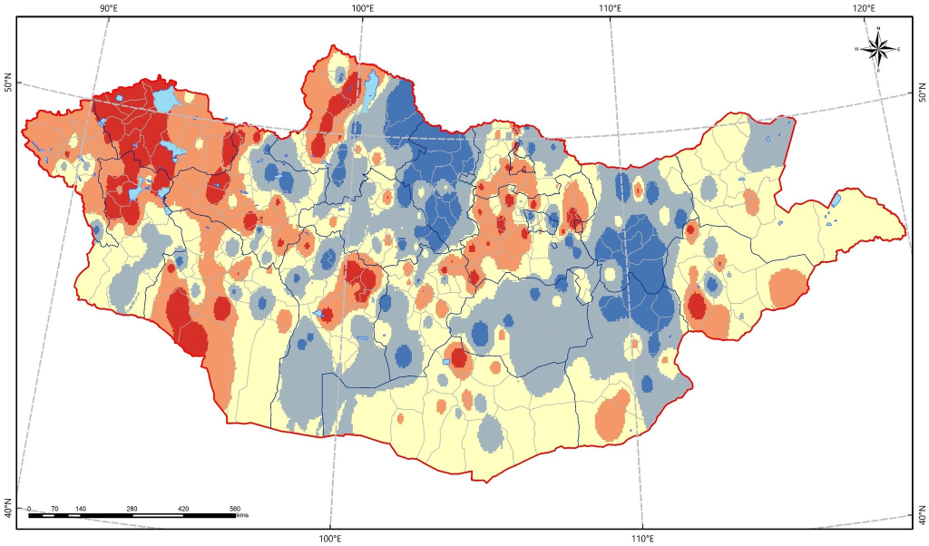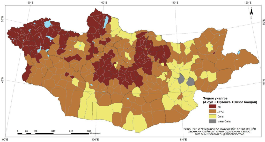 Ус цаг уур, орчны судалгаа, мэдээллийн хүрээлэнгээс 2025 оны 12 дугаар сарын зудын эрсдэлийн ерөнхий үнэлгээг аюулын үзүүлэлтүүд болох энэ зуны ган, зуншлагын байдал, агаарын температур, хур тунадасны дундажтай харьцуулсан хазайлт, цасны зузаан болон 12 дугаар сарын агаарын температур, хур тунадасны урьдчилсан төлөв зэрэг мэдээлэлд үндэслэн боловсруулжээ.