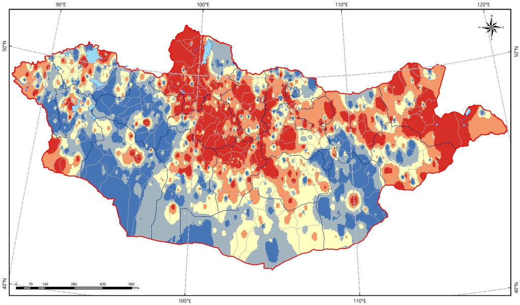 Зудын эрсдэлийн аюул, өртөнгө, эмзэг байдлаар тооцоолсон ерөнхий үнэлгээгээс харахад өвөлжилт хүндрэх эрсдэл нийт нутгийн 23%-д “маш их”, 58%-д “их”, 18%-д “дунд”, 1%-д “бага” байхаар байна. Тухайлбал, Баян-Өлгий, Увс, Хөвсгөл, Сэлэнгэ, Дархан-Уул, Төв аймгуудын ихэнх, Ховд, Завхан, Баянхонгор, Архангай, Өвөрхангай зарим нутгаар зудын эрсдэл ихтэй байх төлөвтэй байна.