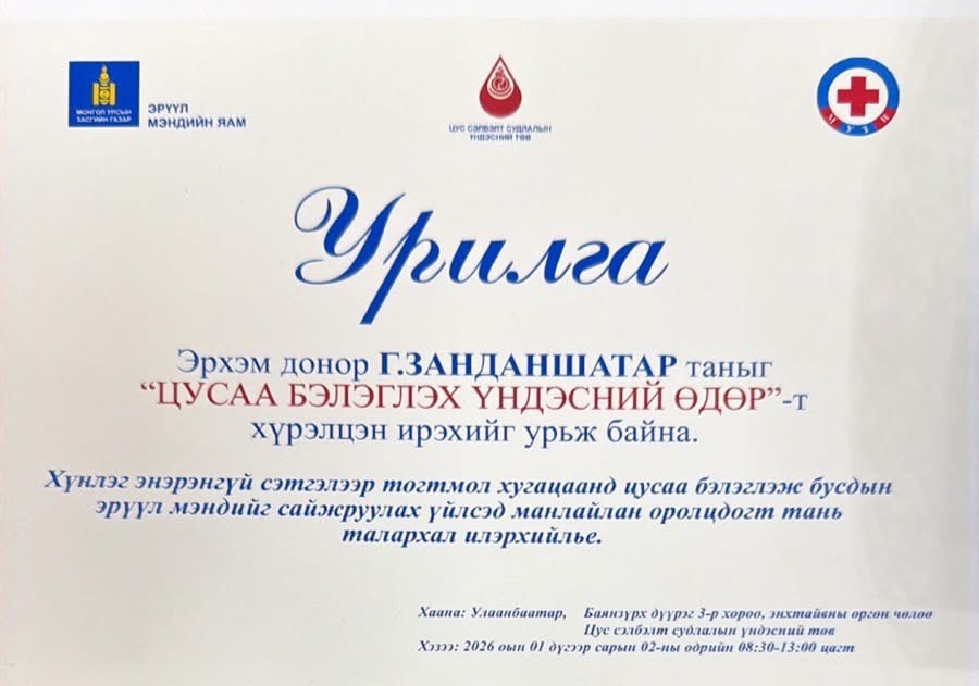 Ерөнхий сайд Г.Занданшатар Цус сэлбэлт, судлалын үндэсний төвд бүртгэлтэй донор бөгөөд тус төв донорынх нь хувьд урилга хүргүүлсний дагуу өнөөдөр (2026.01.02) “Цусаа бэлэглэх үндэсний өдөр”-т зориулсан үйл ажиллагаанд оролцов. Манай улс 10 дахь жилдээ нэгдүгээр сарын 03-ны өдрийг “Цусаа бэлэглэх үндэсний өдөр” болгон тэмдэглэн өнгөрүүлж байна.