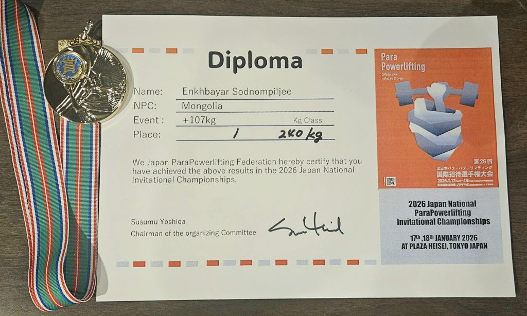 Япон улсын нийслэл Токио хотод пара пауэрлифтингийн “2026 Japan National Para Powerlifting Invitational Championships” тэмцээн энэ сарын 17-18-ны өдрүүдэд болж өндөрлөлөө. Тэмцээнд манай улсаас Үндэсний шигшээ багийн дасгалжуулагч Д.Баттулгын удирдлага дор 107 кг-ын жинд Хөдөлмөрийн баатар, гавьяат тамирчин Э.Содномпилжээ, 59 кг-д Д.Жигмэд, 65 кг-д А.Амартайван нар оролцсон байна. Тэмцээний 59 кг-ын жинд Даваа-Очирын Жигмэд цээжнээс 153 кг-ыг шахсанаар мөнгө, 65 кг-ын жинд А.Амартайван 157 кг-ыг шахсанаар алтан медаль хүртсэн юм.