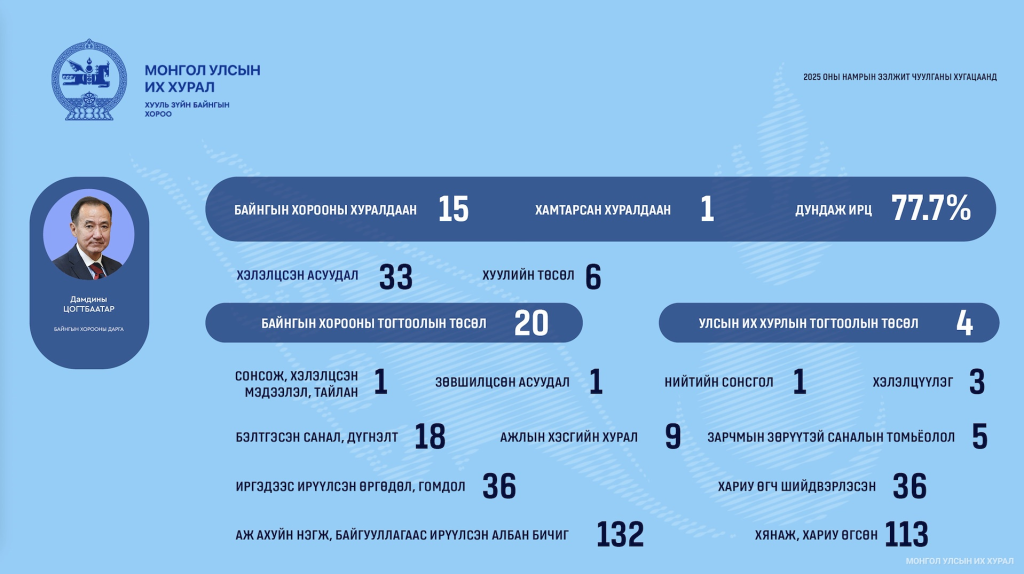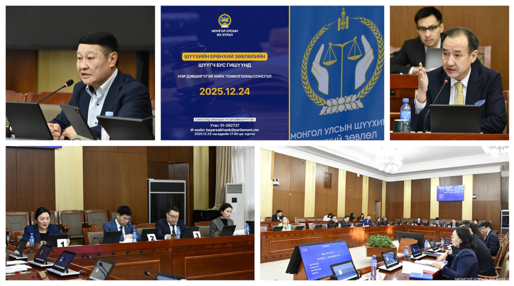 Мөн Монгол Улсын шүүхийн тухай хуульд Шүүхийн ерөнхий зөвлөлийн шүүгч бус гишүүнийг Улсын Их Хурал нээлттэйгээр нэр дэвшүүлж, сонгон шалгаруулсны үндсэн дээр нэр дэвшигчийн сонсгол хийж, томилохоор заасан. Хууль зүйн байнгын хороо 2025 оны 09 дүгээр сарын 29-ний өдөр Шүүхийн ерөнхий зөвлөлийн шүүгч бус гишүүнд нэр дэвшигчийн сонгон шалгаруулалтыг зарлах тухай Байнгын хорооны тогтоолыг баталж, сонгон шалгаруулалтыг журамд заасан найман үе шатны хүрээнд зохион байгууллаа. Сонгон шалгаруулалтаар ажлын хэсгийн гишүүдийн олонхын санал авсан нэр дэвшигчдийг Байнгын хороонд санал болгож, Хууль зүйн байнгын хороо Шүүхийн ерөнхий зөвлөлийн шүүгч бус гишүүнд нэр дэвшигчийн томилгооны сонсголыг 2025 оны 12 дугаар сарын 24-ний өдөр зохион байгуулсан.