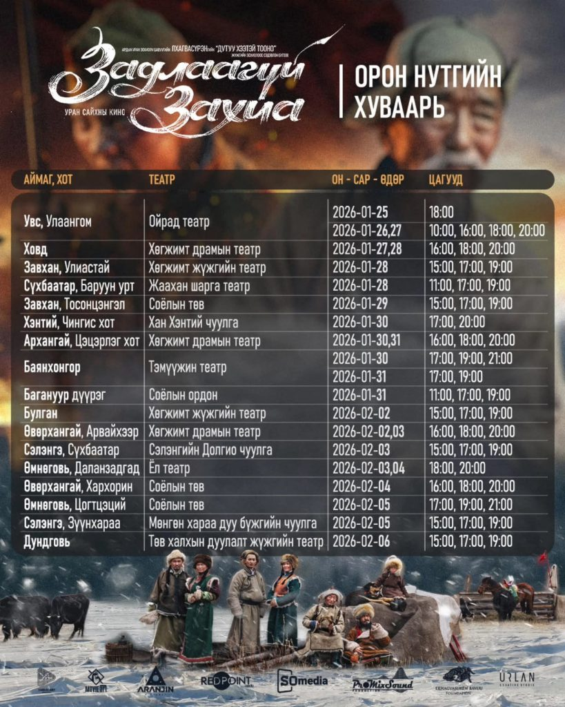 - 2026-02-06 ДУНДГОВЬ аймаг – Төв халхын дуулалт жүжгийн театрт 15:00, 17:00, 19:00 цагуудаас тус тус үзэгчдийн хүртээл болно.