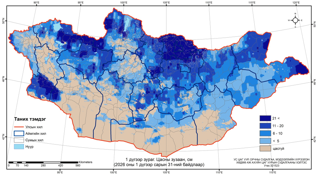 Цаг уурын байгууллагаас арав хоногт нэг удаа хийдэг хээрийн цасны хэмжилтийн мэдээгээр нэгдүгээр сарын 31-ний байдлаар нийт нутгийн 73 хувьд цастай байна.
