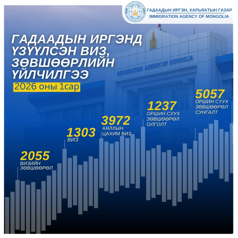 Эдгээр тоон үзүүлэлтийг өнгөрсөн оны мөн үеийнхтэй харьцуулахад виз, визийн зөвшөөрөл олголт 42.4, оршин суух зөвшөөрөл олголт 1.6, оршин суух зөвшөөрлийн хугацаа сунгалт 68.1 хувиар нэмэгджээ.