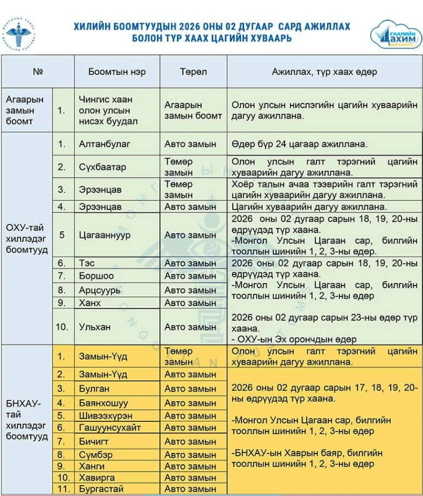 Харин “Чингис хаан” олон улсын нисэх буудал олон улсын нислэгийн цагийн хуваарийн дагуу ажиллана. Мөн “Сүхбаатар”, “Эрээнцав” төмөр зам болон автозамын боомт цагийн хуваарийн дагуу хэвийн ажиллана. Хуваарийг танилцуулъя.