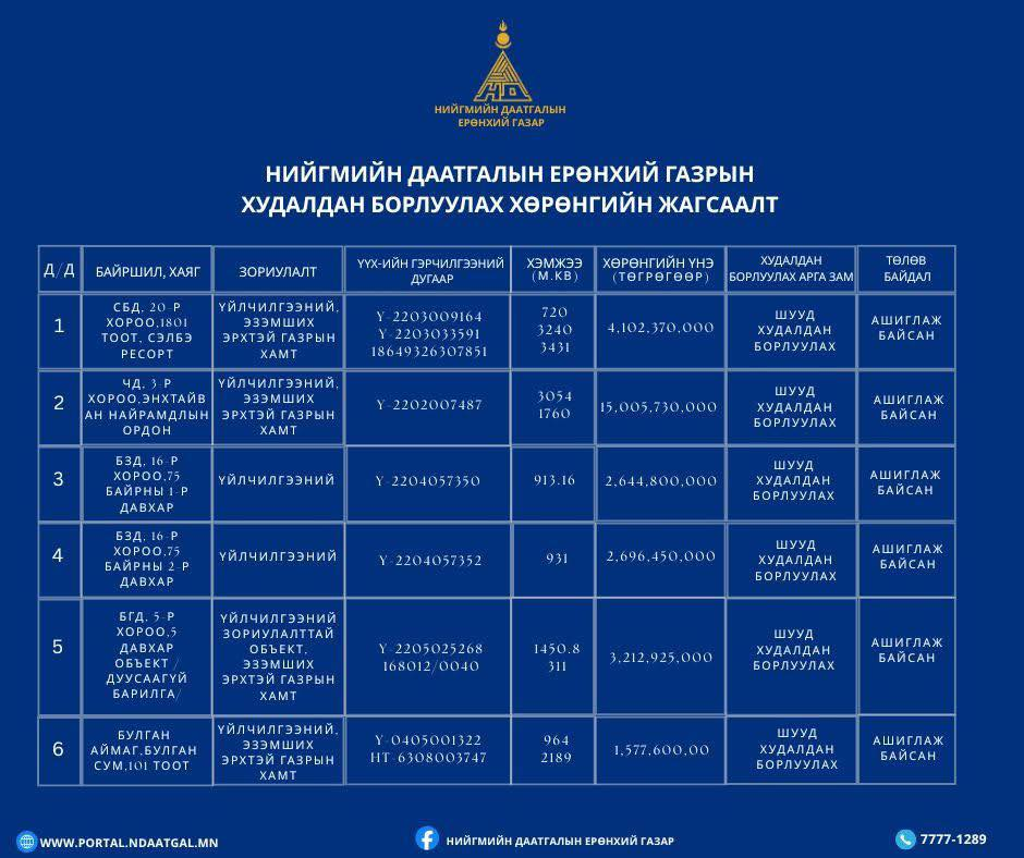 Худалдан борлуулагдаагүй үлдсэн 37 ширхэг хөрөнгөнөөс шууд худалдан борлуулах боломжтой 11 үл хөдлөх хөрөнгийн мэдээллийг нээлттэй мэдээллэж байна.