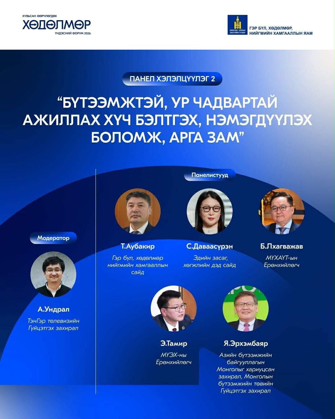 “Хувьсан өөрчлөгдөх хөдөлмөр–2026” үндэсний форум өнөөдөр Монголын үндэсний худалдаа аж үйлдвэрийн танхимын Их танхимд панел хэлэлцүүлгээр үргэлжилж байна.