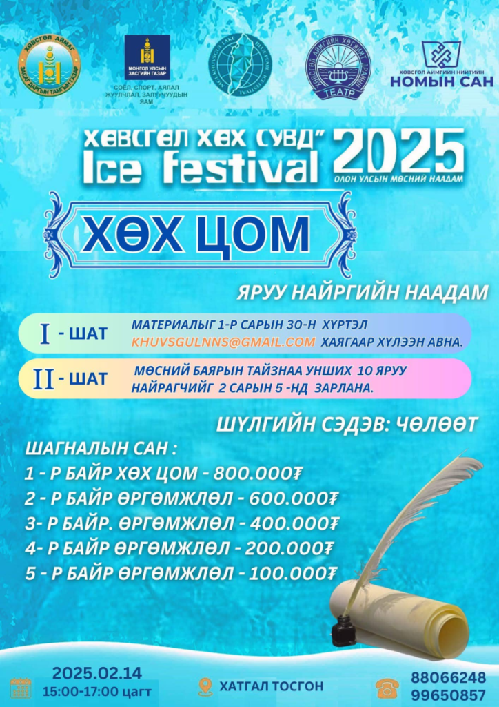 Шүлгийг энэ жил чөлөөт сэдвийн хүрээнд бичих бөгөөд энэ сарын 30 хүртэл khuvsgul@gmail.com хаягаар хүлээн авч эхний шатны шалгаруулалтыг хийж хоёрдугаар шатанд мөсний баярын тайзнаа шүлгээ унших 10 яруу найрагчийг 2 дугаар сарын 5-нд зарлана.