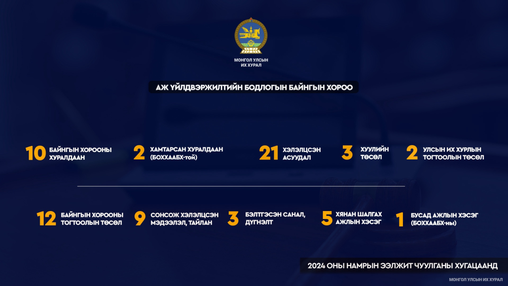 УИХ-ын 2024 оны намрын ээлжит чуулганы хугацаанд хэрэгжүүлсэн бодлого, үйл ажиллагааныхаа талаар Аж үйлдвэржилтийн бодлогын байнгын хорооны дарга, гишүүд энэ сарын 29-нд мэдээллээ.