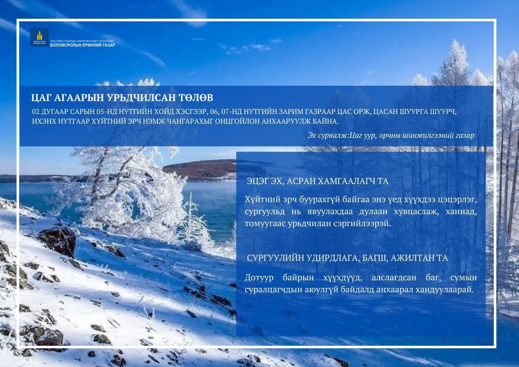 02 дугаар сарын 05-нд нутгийн хойд хэсгээр, 06, 07-нд нутгийн зарим газраар цас орж, цасан шуурга шуурч, ихэнх нутгаар хүйтний эрч нэмж чангарахыг онцгойлон анхааруулж байна.