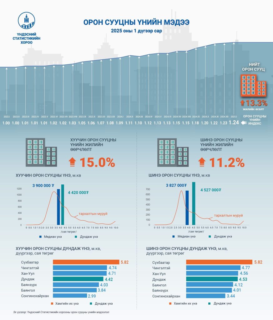 2025 оны 1 дүгээр сарын байдлаар Улаанбаатар хотод орон сууцны үнэ өмнөх оны мөн үеэс 13.3 хувиар, өмнөх сараас 0.5 хувиар тус тус өссөн байна.