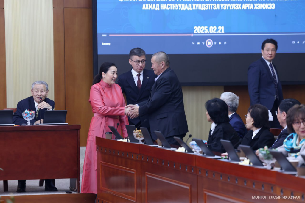 Монгол Улсын шинэ Үндсэн хуулийг батлалцсан, байнгын ажиллагаатай парламент, түүний Тамгын газрыг анхлан байгуулахад тулгын чулууг нь тавилцаж, сэтгэл зүтгэлээ зориулсан нэр хүндтэй ахмадууддаа Улсын Их Хурлын дэд дарга Х.Булгантуяа чин сэтгэлийн талархал дэвшүүлээд, намрын чуулганы хугацаанд баталсан хууль тогтоомж, бодлогын шийдвэрүүдийг танилцуулсан юм. Энэ оны нэгдүгээр сарын 01-нээс хэрэгжиж эхэлсэн Ахмад настны тухай хуульд нэмэлт, өөрчлөлт оруулах тухай хууль, түүнд туссан ахмад настны хөдөлмөр эрхлэлтийг дэмжих, ахмадын сан байгуулах зэрэг шинэлэг зохицуулалтуудын тухай, Ахмадын үндэсний чуулган, Анхдугаар Үндсэн хуулийн 100 жилийн ойн хүрээнд хийсэн ажлуудын талаар танилцуулж, удахгүй болох сар шинийн баяр, гарч буй модон могой жилийн мэндийг дэвшүүлэн, эрүүл энхийг хүслээ.