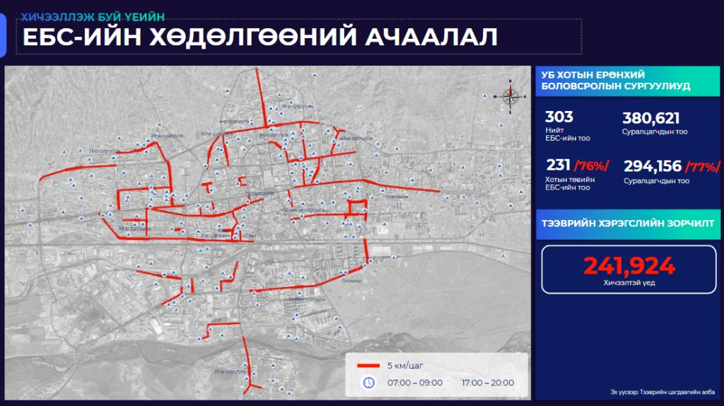 Нийслэлийн хэмжээнд ЕБ-ын 303 сургуульд 380.621 сурагч суралцаж байна. Нийт сургуулийн 76 хувь нь буюу 231 сургууль хотын төвд байрладаг бөгөөд тэдгээр сургуульд 294.156 сурагч суралцаж байгаа юм. Замын хөдөлгөөний удирдлагын төвийн датанд тулгуурлан судлаачдын тооцоолсноор ЕБС-иудын ойр орчимд замын хөдөлгөөний ачаалал эрс нэмэгддэг. Хичээлтэй үед өдөрт 241.924 тээврийн хэрэгсэл хөдөлгөөнд оролцдог бол амралттай үед 132.501 болтлоо 54.7 хувиар хөдөлгөөний ачаалал буурдаг байна.