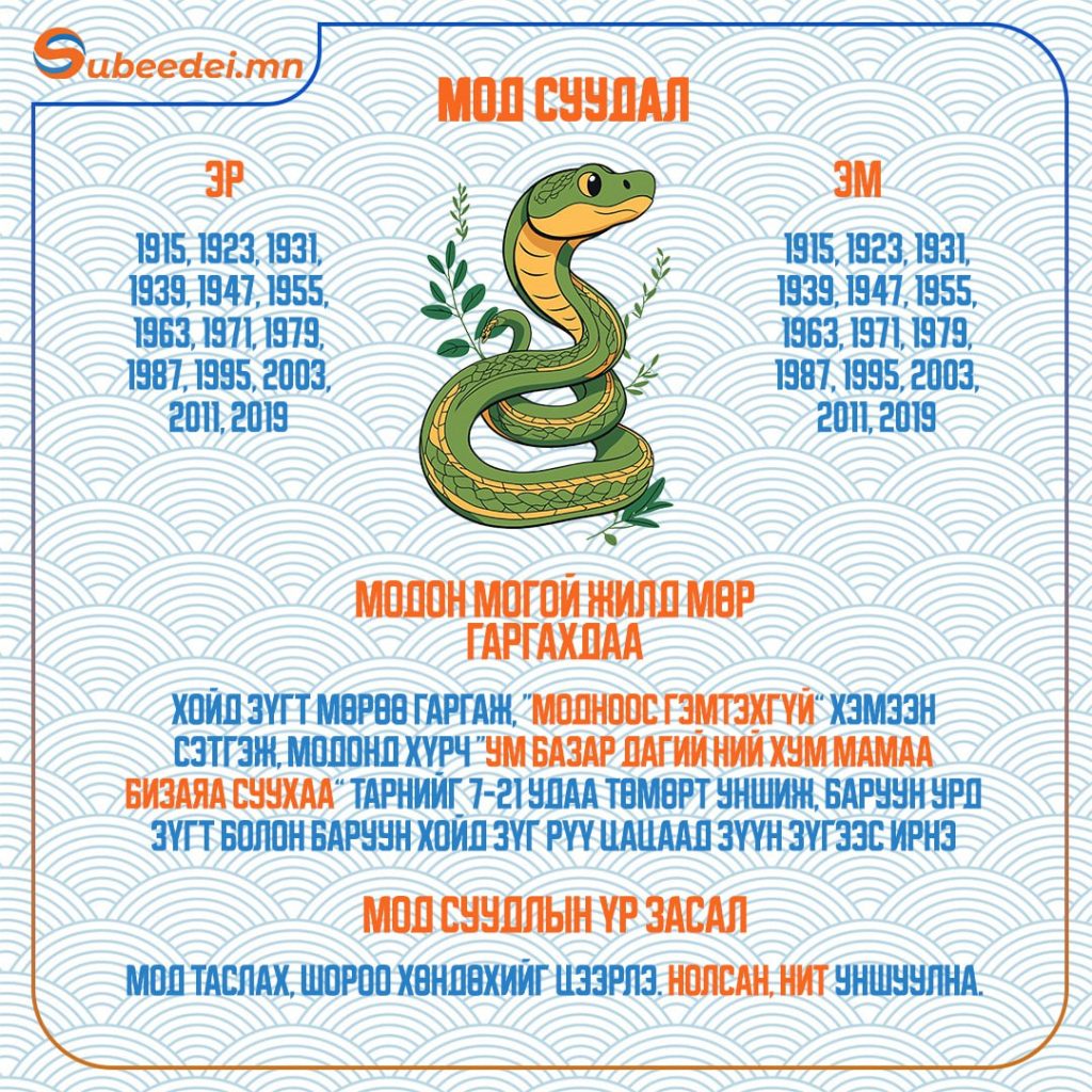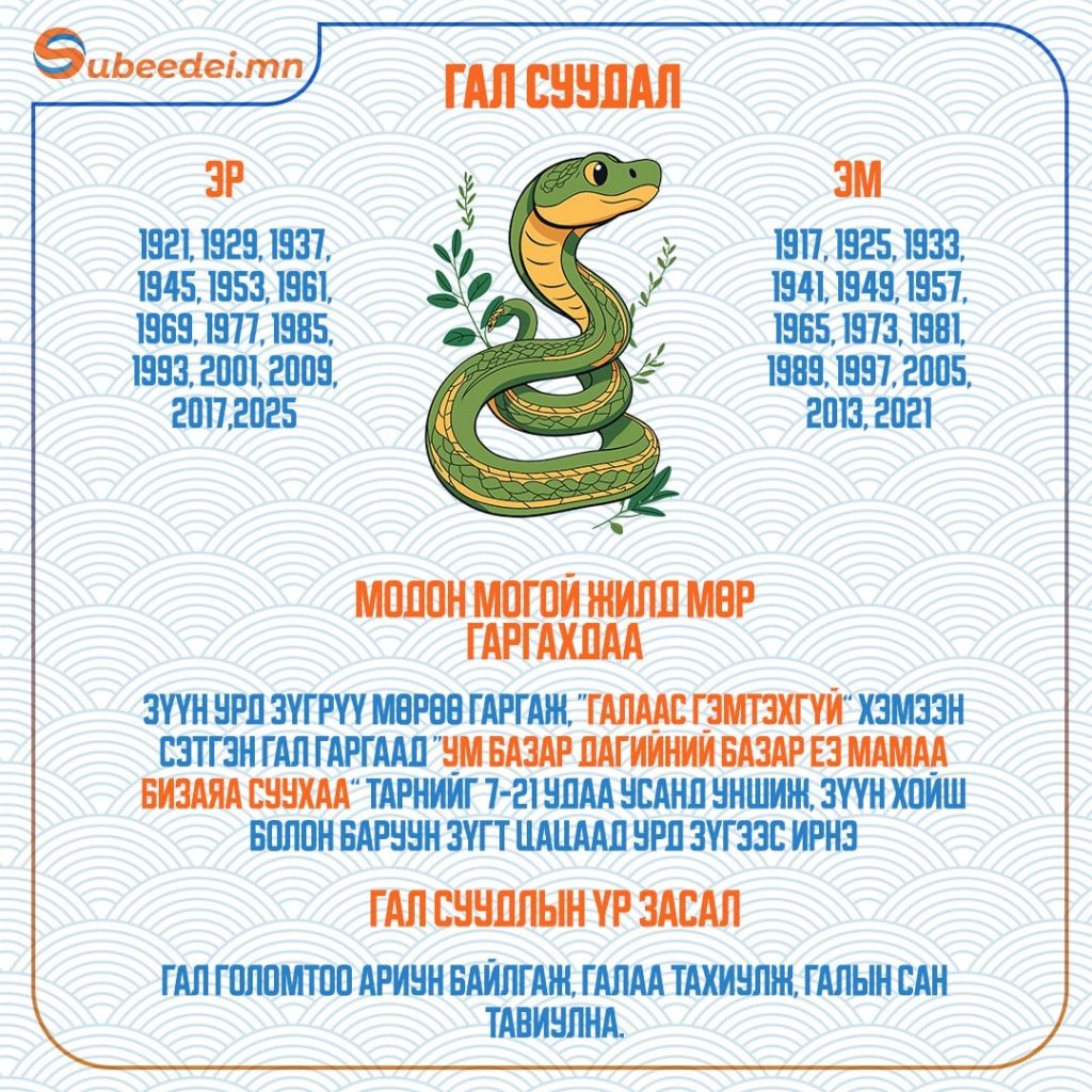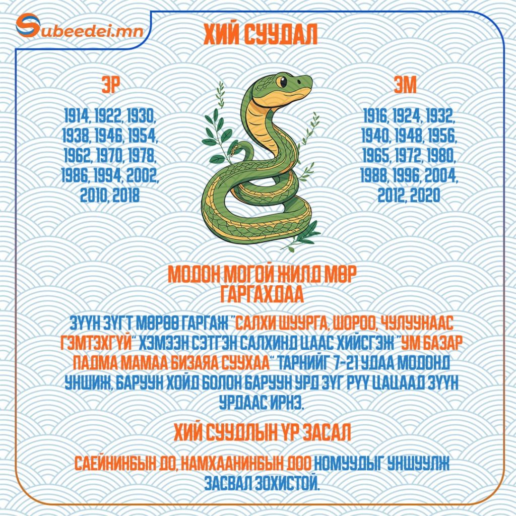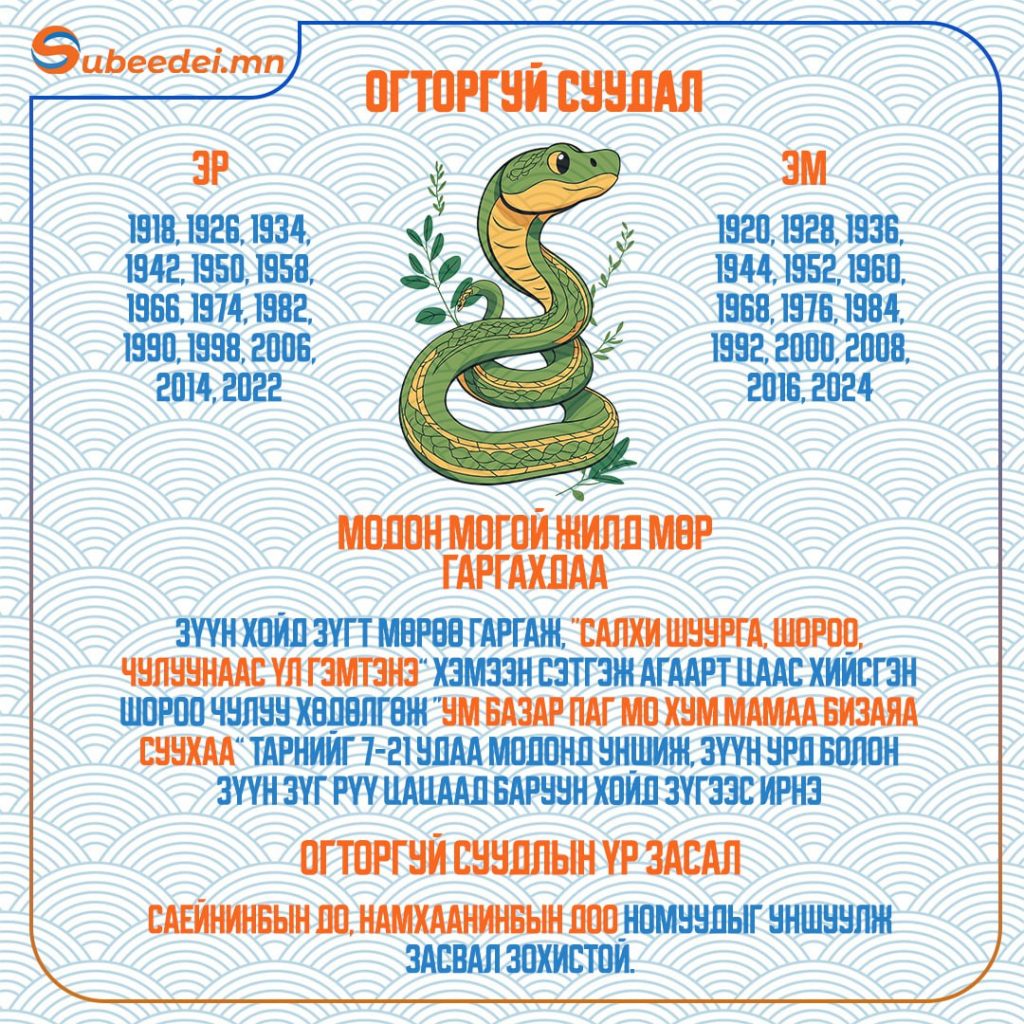 Хаврын тэргүүн сарын шинийн нэгний өглөө зүг, мөрөө хэрхэн гаргаснаар тухайн жилийн өнгийг тодорхойлдог билээ. Тэгвэл XVII жарны “Элдэв эрдэнэт” хэмээх модон могой жилийн сарын шинийн өглөө зүгээ хэрхэн гаргах мөн тухайн жилд ямар засал хийлгэх тухай мэдээллийг хүргэж байна.