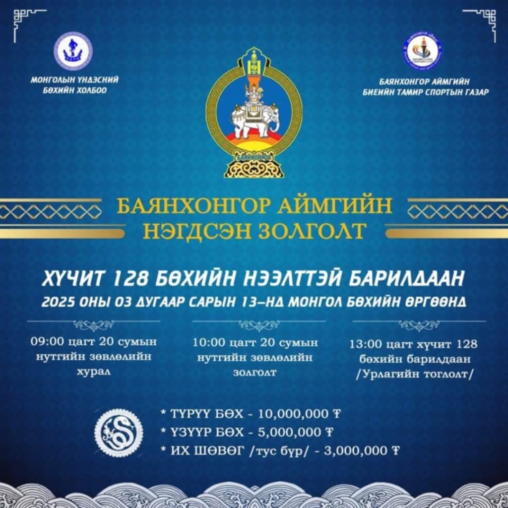 Өнөөдөр 13:00 цагаас Монгол бөхийн өргөөнд болох Баянхонгор аймгийн нэгдсэн золголтод зориулсан Улс, аймаг, цэрэг, сумын алдар цолтой хүчит 128 бөхийн НЭЭЛТТЭЙ барилдаанд болно.