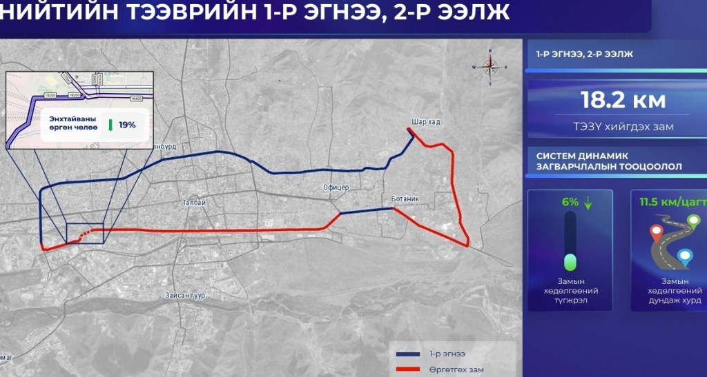 Тодруулбал, замын хөдөлгөөний ачаалал ихтэй байршлуудад нийтийн тээврийн автобусны нэгдүгээр эгнээг хоёр үе шаттай өргөтгөж, гэр хороололд нийтийн тээвэр хүртээмжгүй хэсэгт авто зам барьснаар Улаанбаатар хотын түгжрэл 31.7 хувиар буурах тооцоолол бүхий төслийг нийслэлийн Бодлогын судалгаа, шинжилгээний төвийн Эрдэмтдийн зөвлөл танилцуулав.