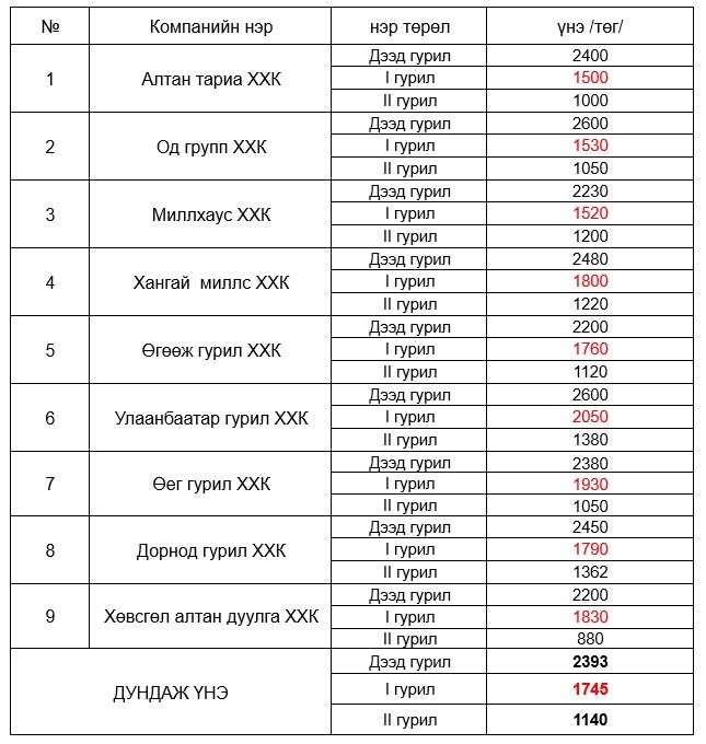 Гурилын үйлдвэрүүдийн ҮЙЛДВЭРИЙН ҮНЭ одоо ийм байна.