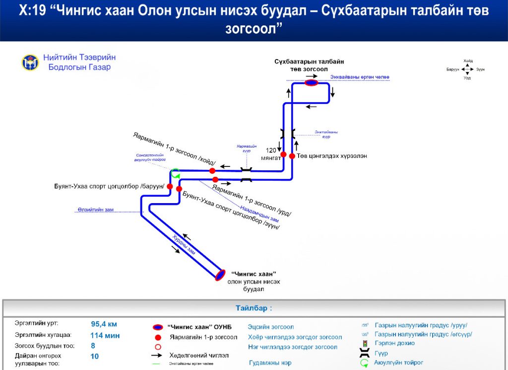Х:19-Сүхбаатарын талбай, Төв цэнгэлдэх хүрээлэн, Яармагийн 1-р зогсоол, Буянт-Ухаа спорт цогцолбор, “Чингис хаан” олон улсын нисэх буудал