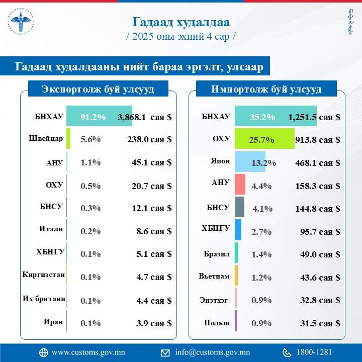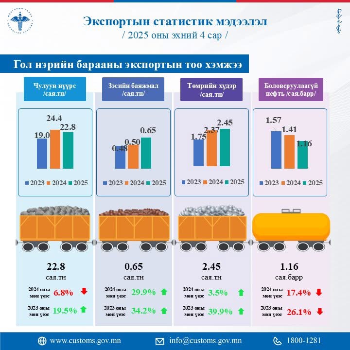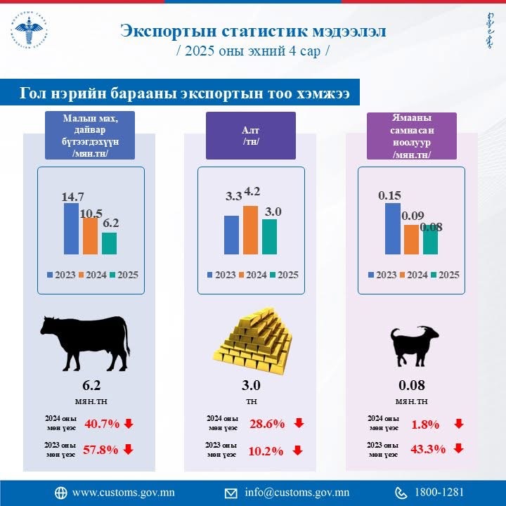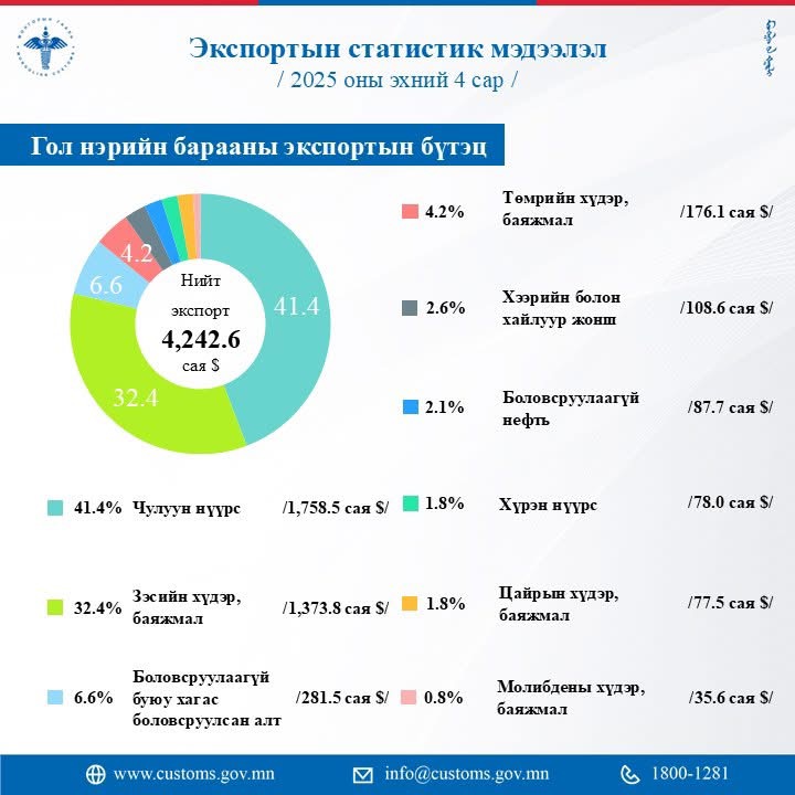 2025 оны эхний 4 сарын дүнгээр экспортод 4242.6 сая ам.долларын бараа, түүхий эд гаргасан нь өнгөрсөн оны мөн үетэй харьцуулахад 14.1 хувиар буурсан байна гэж ГЕГ-аас мэдээллээ.