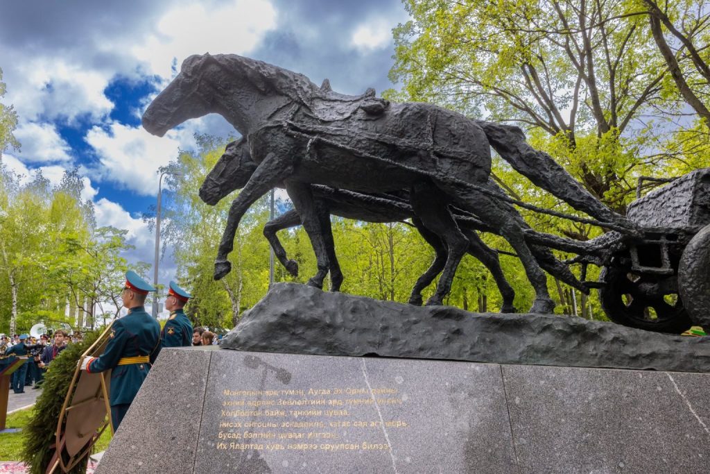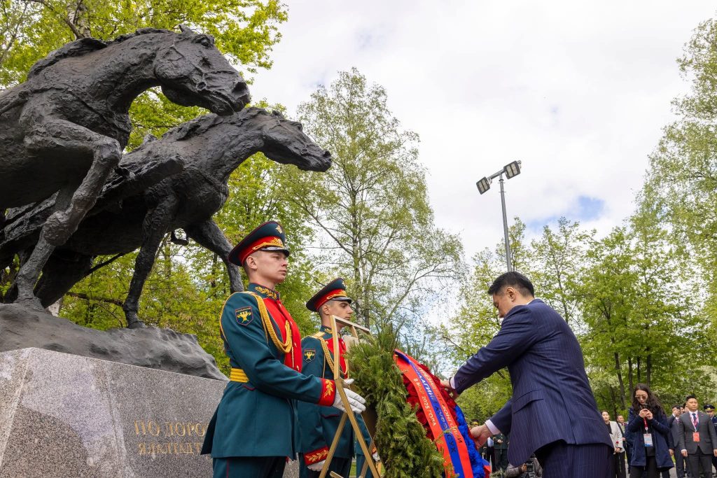 Ерөнхийлөгч У.Хүрэлсүх ОХУ-ын нийслэл Москва хотын Хүндэтгэлийн дэнж дэх “Ялалтын цэцэрлэгт хүрээлэн”-д Монголын ард түмнээс бэлэг болгосон “Ялалтад тэмүүлсэн морьд” хөшөөнд хүндэтгэл үзүүллээ.