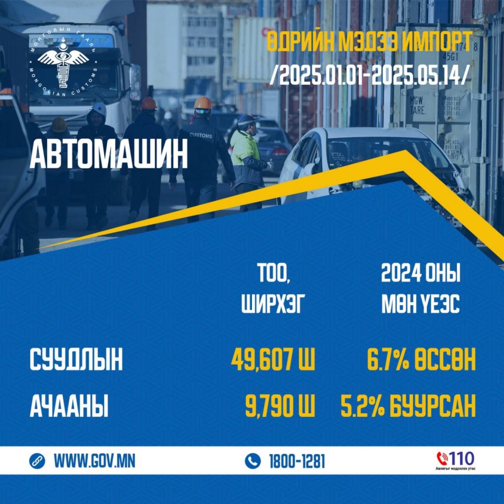 Монгол Улс 2025 он гарснаас хойш 5-р сарын 14-ний өдрийн байдлаар 49,607 ширхэг суудлын автомашин импортолсон нь өмнөх оны мөн үетэй харьцуулахад 6,7 хувиар өссөн үзүүлэлттэй байна.