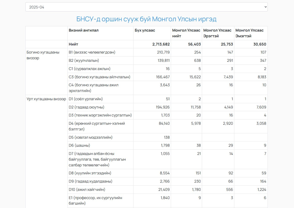БНСУ-д 2025 оны 04 дүгээр сарын 30-ны өдрийн байдлаар гадаадын 2,713,682 иргэн оршин сууж байгаагаас Монгол Улсын 56,403 иргэн байна.