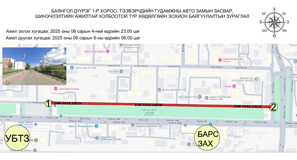 Нарны гүүрний баруун талын авто замаас УБТЗ-ын хойд талын автобусны буудал хүртэлх авто замыг 6 дугаар сарын 4-ний 23:00 цагаас хааж, шинэчилнэ. Тус авто замыг 6 дугаар сарын 6-ны 06:00 цагт нээнэ.