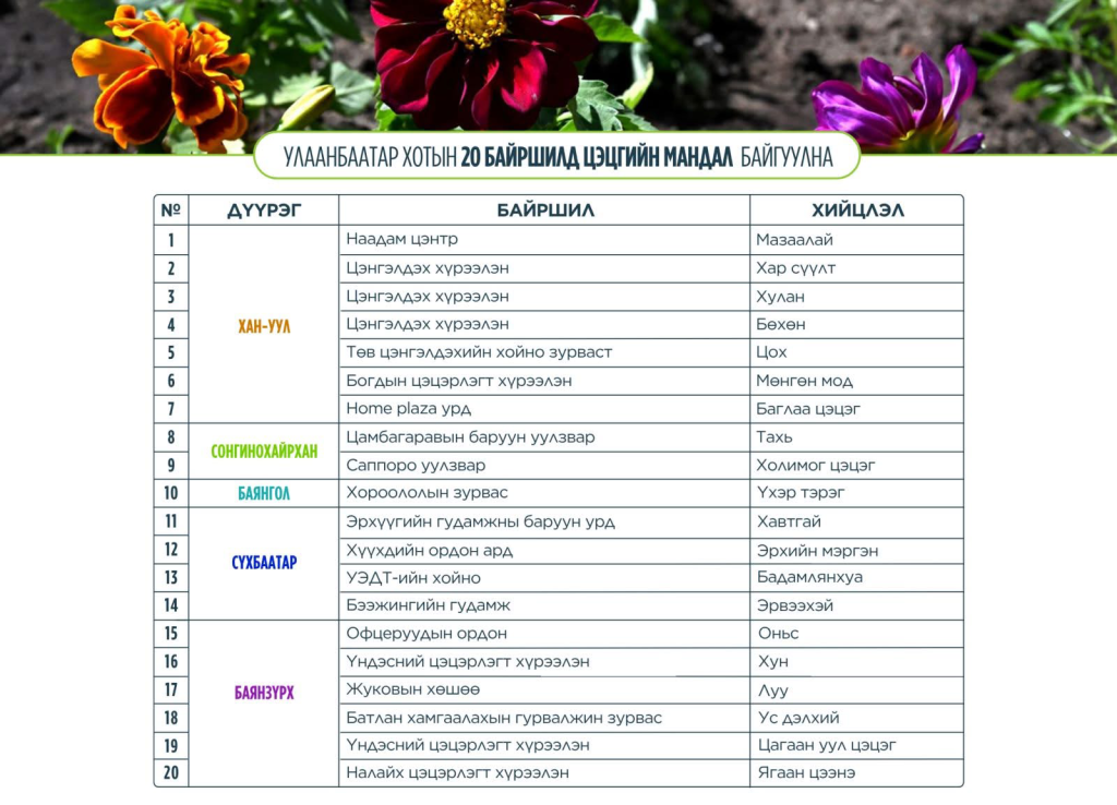 УБЗАА-ны Хотын ногоон байгууламж, цэцэрлэгжүүлэлтийн хэлтсийн дарга Н.Отгонбаяр “Тус байгууламжуудад Мандарваа, Хун, Хилэн зэрэг цэцгүүдийг сонгосон. Иргэн бүр ухамсартай байж, тарьсан цэцгийг хайрлаж, гамтай байхыг уриалж байна” гэв.