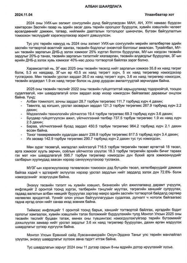 2025 оны төсөв батлах үеэр УИХ-ын гишүүн Г.Тэмүүлэн, Ж.Баярмаа, Б.Түвшин, Д.Энхтүвшин нар төсөв танах шаардлагыг Ерөнхий сайдад хүргүүлсэн. Энэ хүрээнд анх удаа алдагдалгүй төсөв батлагдсан билээ.